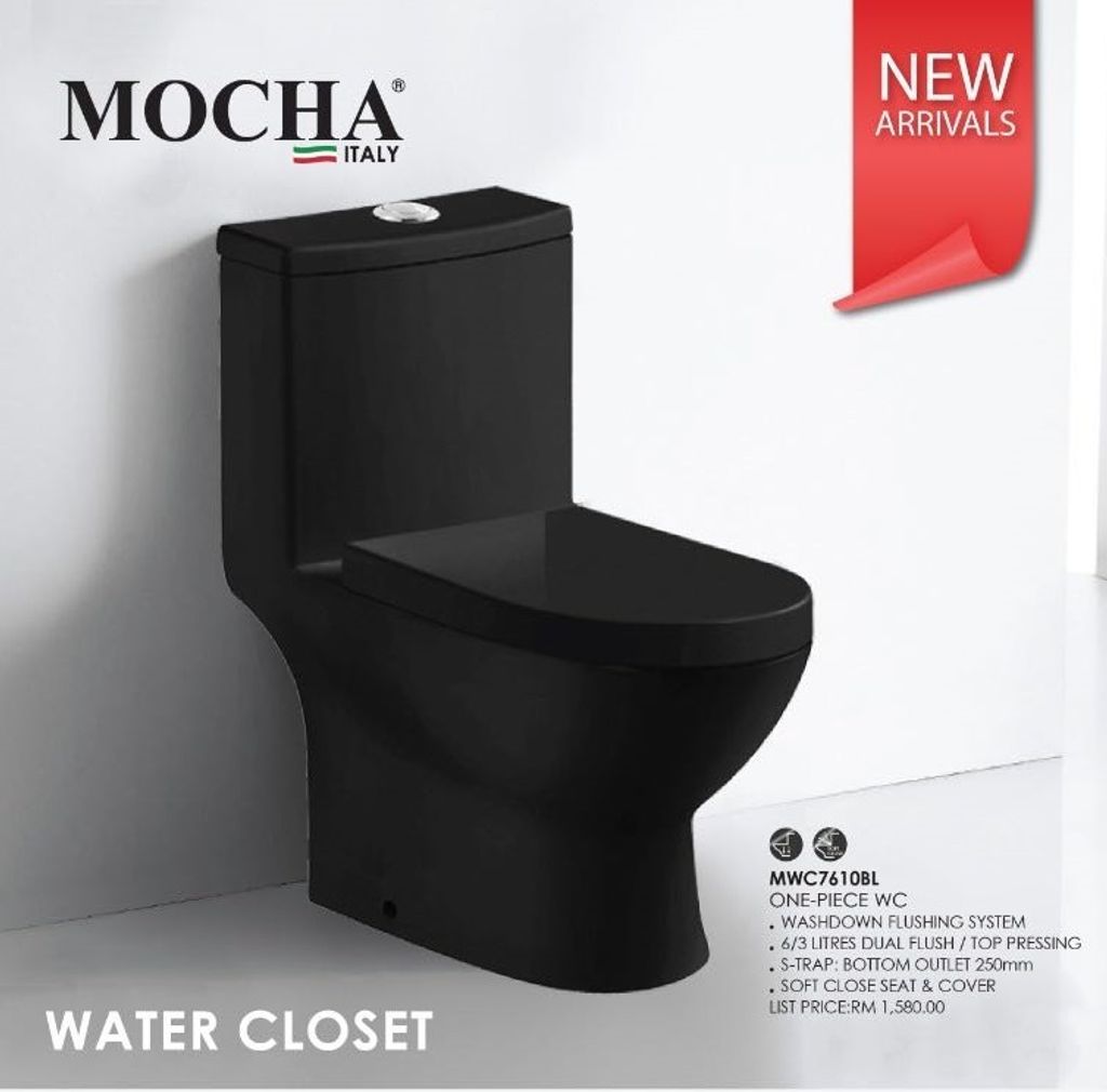 MOCHA MWC7610BL (S Trap) LUXURY MODERN MATT BLACK One Piece Water Closet ,Washdown Toilet Bowl WC